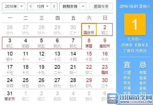 2016年10月1日至10月7日放假,共7天。