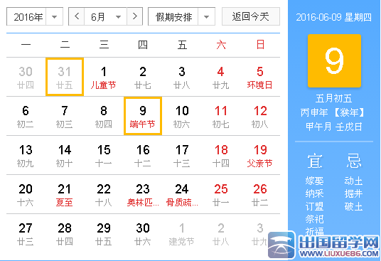 6月9日(星期四,农历端午节当日)为国家法定节假日