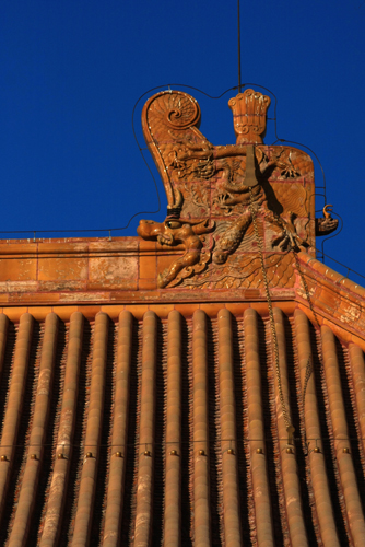 太和殿正脊的鸱吻规格最大,垂脊上望兽数目最多,有11个。其它按阳数递减,区别宫殿等级。