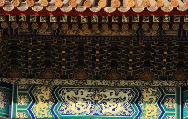 太和殿采用最高级的和玺彩绘,以龙为主,衬以云气图案,用青、绿、红色衬托,沥粉贴金,典雅华贵。