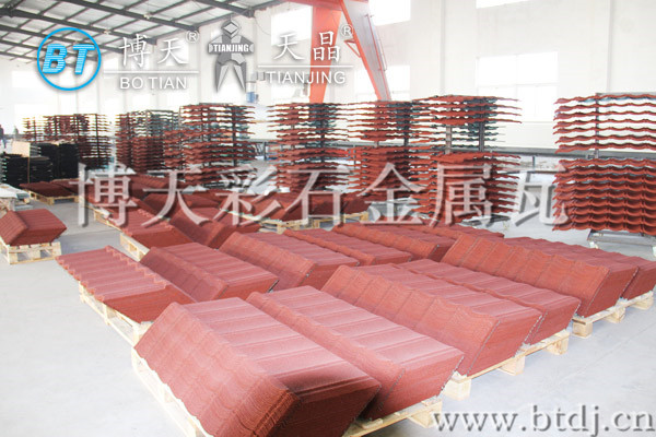 彩石金属瓦是一种国外引进的新型金属材质屋面瓦,基板是用0.4mm厚度的镀铝锌钢板,用丙稀酸树脂作为粘合剂,在钢板表层铺设彩色的玄武岩烧结砂。是一种美观大方,经久耐用的屋顶瓦片,常用语平改坡、别墅屋顶、广场等项目。